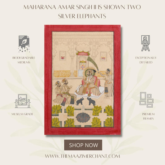 Maharana Amar Singh II is shown two silver elephants